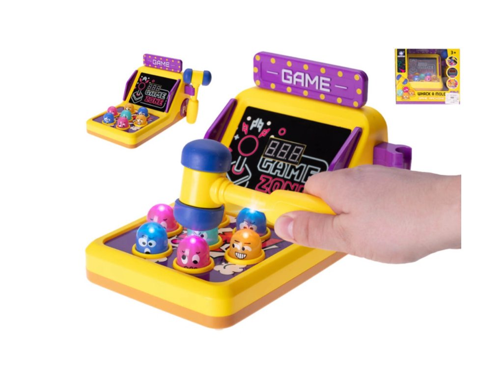 Cílem je zasáhnout rychle se objevující krtky pomocí speciálního kladívka – skvělý trénink na postřeh a rychlé reflexy! Díky kompaktním rozměrům se hra hodí jak do dětského pokoje, tak na cesty. Hračka je bezpečná , z odolného materiálu a zabalená v atraktivní krabičce , takže je perfektním dárkem pro každou příležitost.