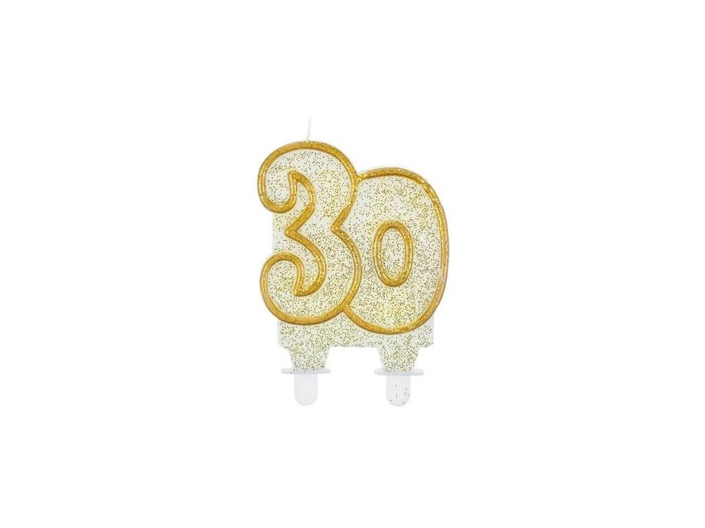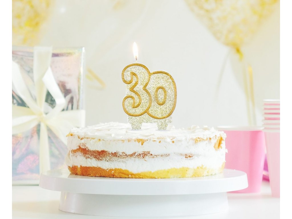 Stylová dortová svíčka ve tvaru čísla „30“ v elegantní zlaté barvě 🎂✨ je ideální volbou pro oslavu třicátých narozenin i dalších významných životních milníků.