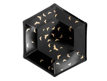 Papírové talířky Halloween – Trick or Treat – sada 6 šestihranných talířků, průměr 18 cm, černé s motivem zlatých netopýrů. Ideální pro Halloween a tematické oslavy.