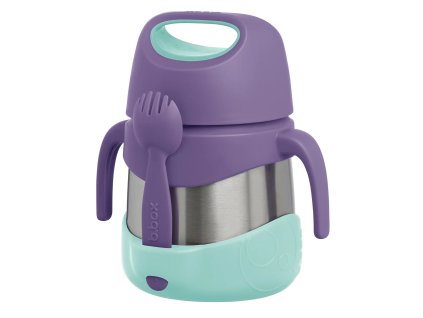 Dvojplášťová široká termoska, aby malé ručičky dosáhly na poslední sousto na dně. Na víčku je "ouško", za které je možné termosku nosit nebo zavěsit na karabinu.