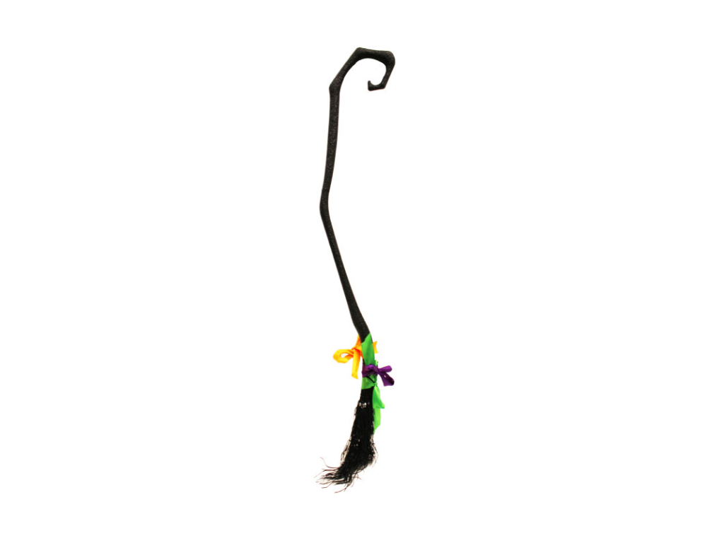 Koště je ozdobeno třemi výraznými širokými stuhami v barvách zelená, fialová a oranžová, které mu dodávají magický a hravý vzhled.