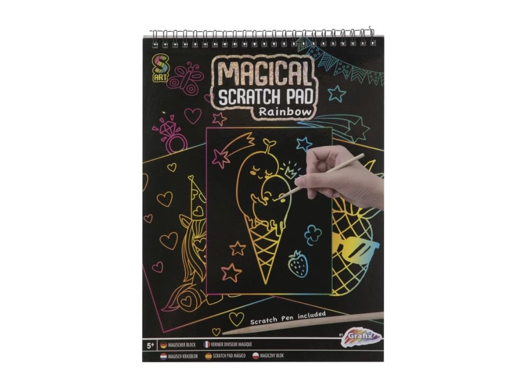 Blok obsahuje 20 vyškrabávacích podložek a dřevěnou škrabací paličku, díky kterým mohou děti i dospělí vytvářet: