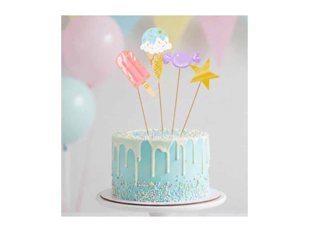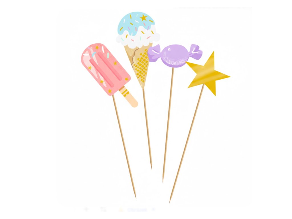 Zápichy do dortu Crazy Cake Party Set 8 ks od značky Amscan rozzáří každý dort a oslavu! 🎂✨ Set obsahuje 8 zápichů na špejli ve čtyřech veselých motivech – zlatá hvězda, nanuk, zmrzlina a bonbon (každý motiv po 2 kusech). 🍭⭐🍦