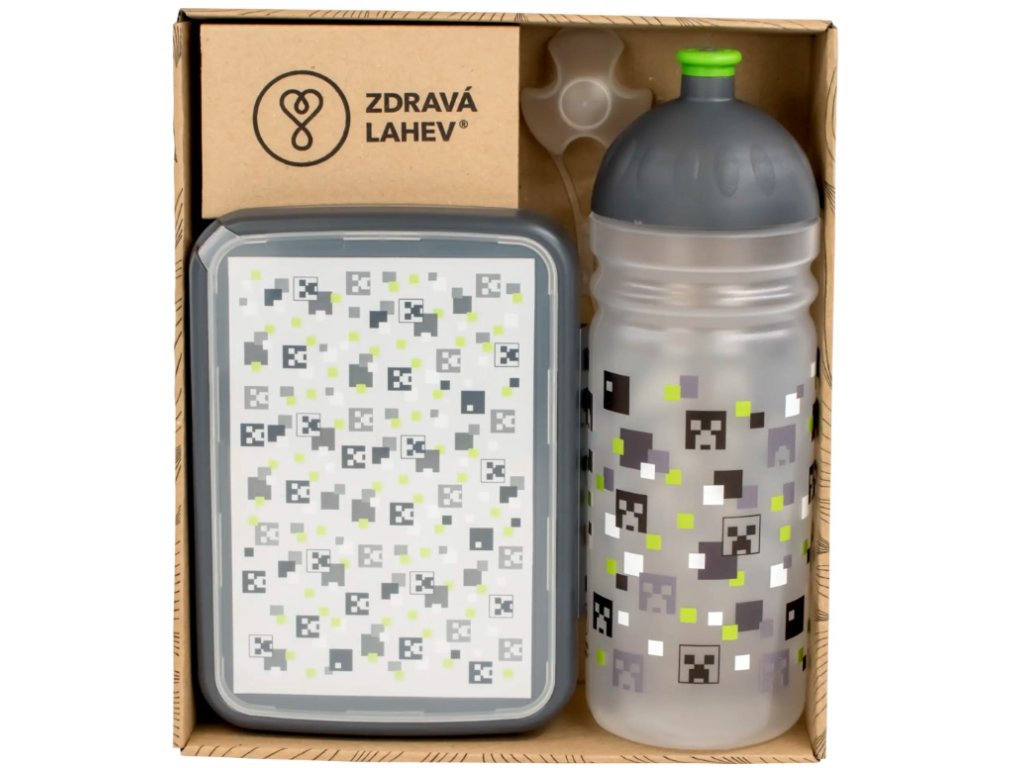 Set obsahuje Zdravou lahev 0,7 l, svačinový box s posuvnou přepážkou, náhradní zátku a ochrannou krytku Floppy. Vše je sladěno v jednotném motivu Pixel head a zabaleno do ekologického dárkového boxu z recyklovaného papíru, vyrobeného v chráněné dílně.