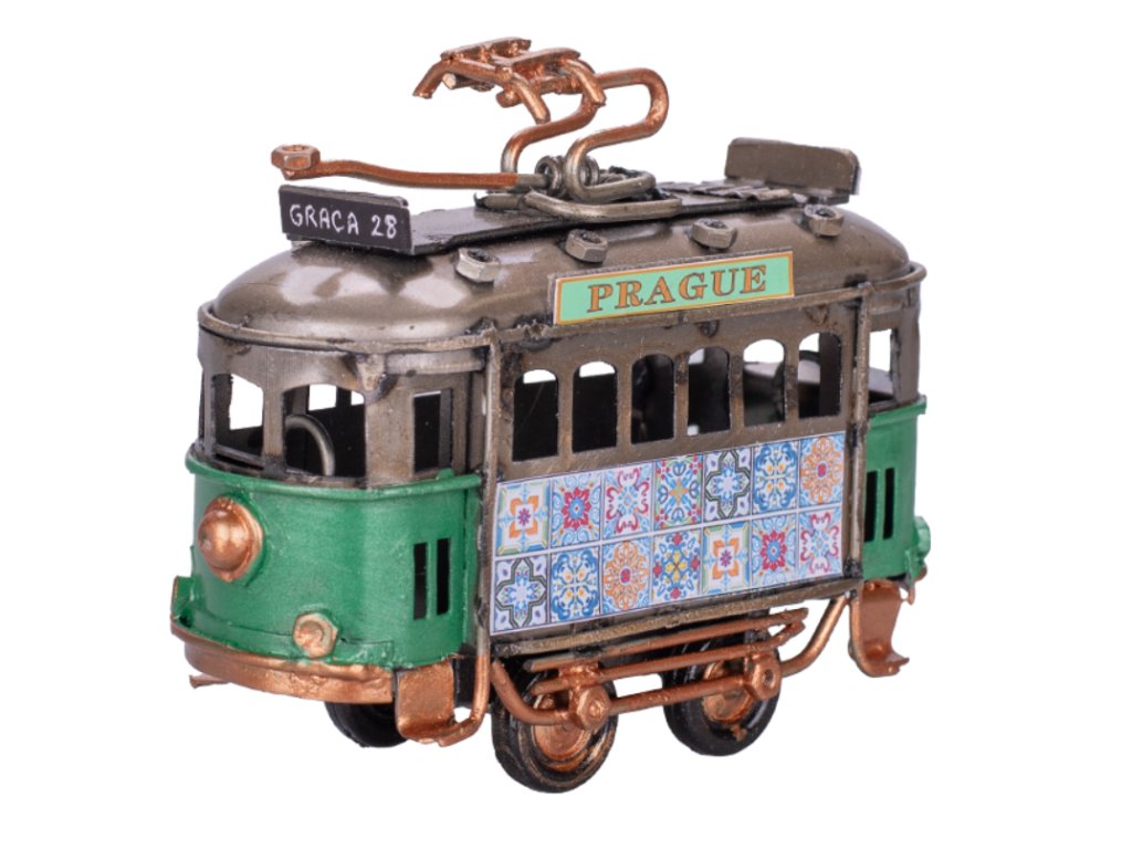 Zelená kovová retro tramvaj s nápisem Prague 9 cm