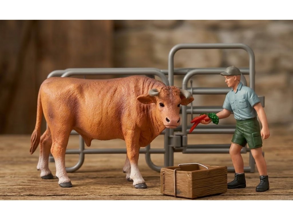 Součástí balení je farmář, který se právě stará o zvířata na statku. V této scéně krmí šťavnatou mrkví hnědého býka, což dětem umožňuje hravou formou poznávat každodenní práci na farmě.
