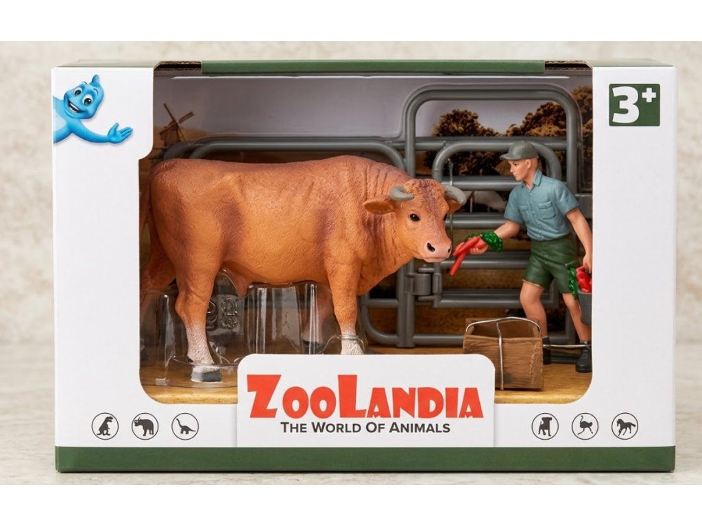 Set ZooLandia Býk hnědý a farmář s doplňky přibližuje dětem život na farmě a péči o hospodářská zvířata.