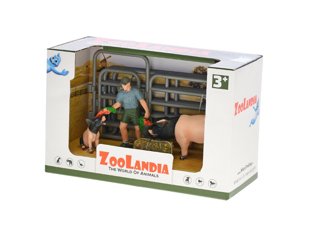 🌾 ZooLandia Farmář s prasetem a selátkem – přeštická prasátka přináší dětem zábavný pohled na život na farmě a péči o hospodářská zvířata. Set obsahuje farmáře v kšiltovce, který krmí prasátka mrkví, prase, selátko, žok sena a ohradník, díky kterým si děti mohou vytvořit vlastní malé hospodářství. 🐖🥕