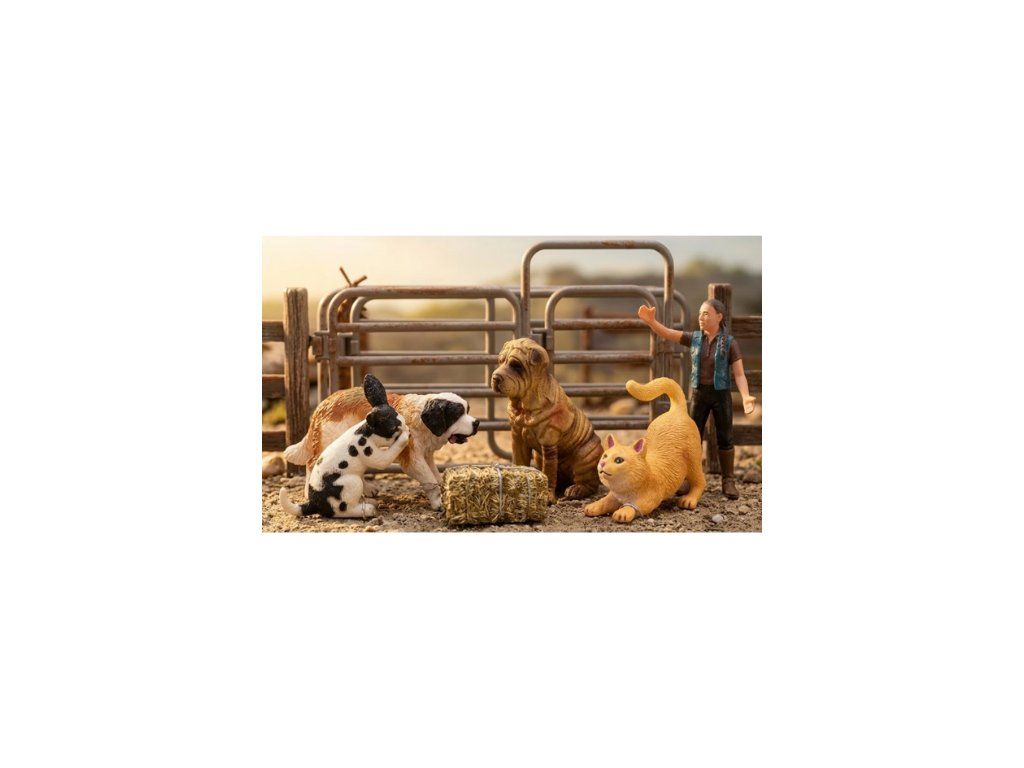 Součástí balení je veselá farmářka, která se stará o zvířata a chod farmy. Společnost jí dělají dva psi – velký a přátelský bernardýn a zajímavý šarpej, známý svou typicky vrásčitou kůží. Na farmě nechybí ani kočka, které můžete dát vlastní jméno – třeba Šklíba, ale fantazii se meze nekladou. V setu je také králík, který patří mezi oblíbená zvířata na venkovských dvorech.