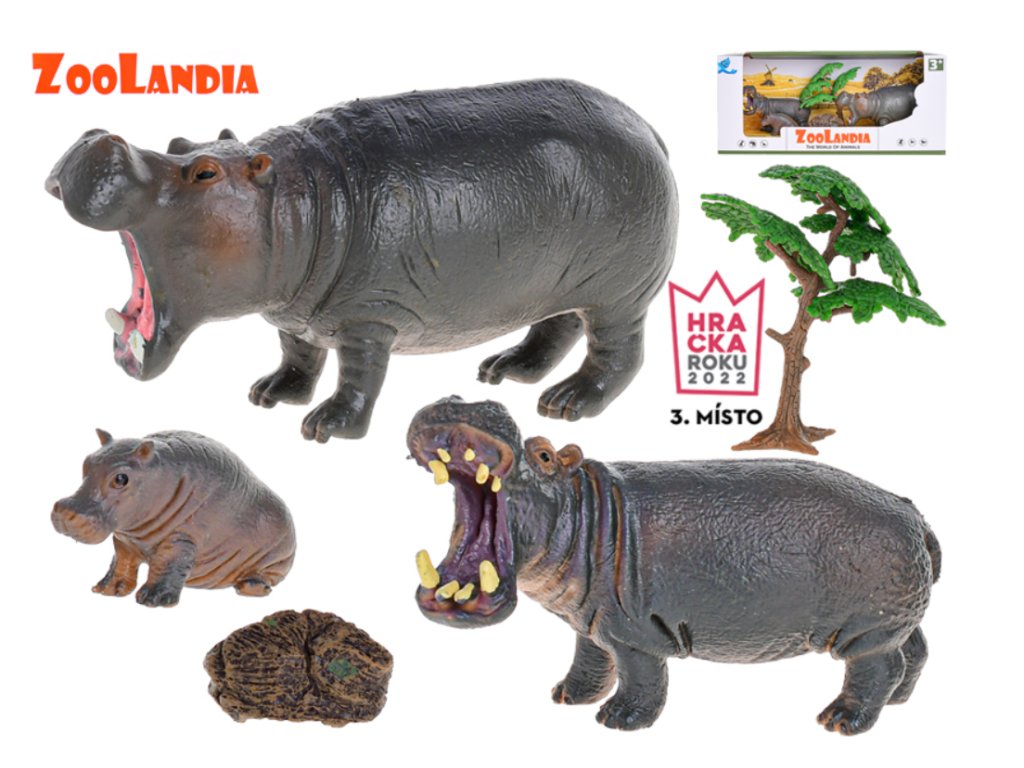 Obsah balení: 3 figurky hrochů, 1 strom, 1 kámen