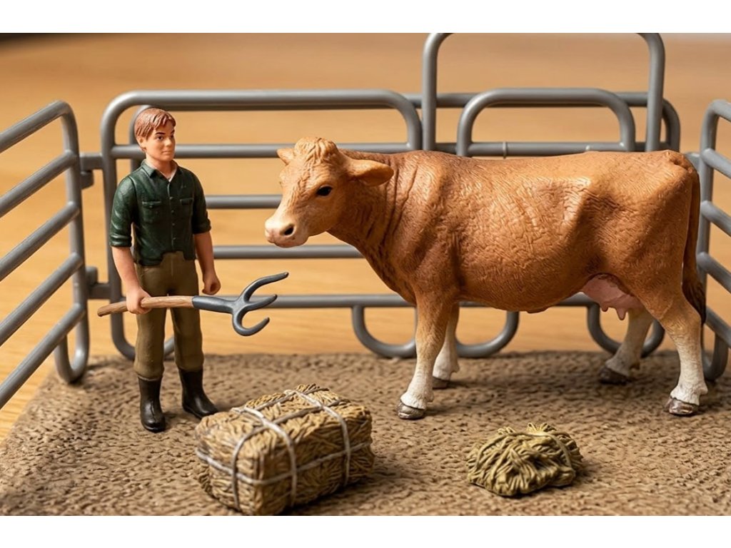 Součástí balení je farmář s vidlemi o výšce 7 cm, který se stará o zvířata a připravuje krmivo. V setu najdete také hnědou krávu, která patří mezi nejdůležitější hospodářská zvířata na farmě.